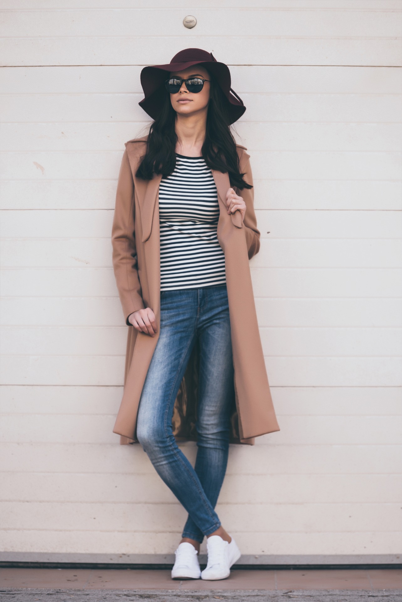 Le week-end approchant à grands pas, j'ai prévu d'aller à la campagne. Inspirez-vous des couleurs automnales et associez-les avec un classique intemporel : le jeans et les motifs marins. Un chapeau élégant apporte la touche finale à votre costume et garde vos cheveux à l'abri des gouttes.